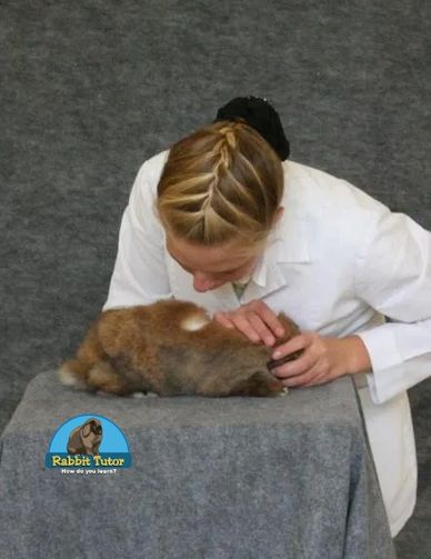 A showman is examining the health and quality of a rabbit.